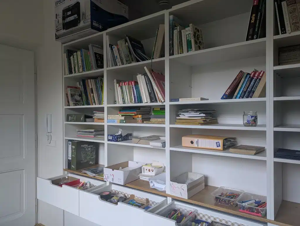 Do knihovny jsme dle témat vložili literaturu k EVVO, kterou využíváme během programů a dnů pro veřejnost. Šuplata slouží jako úložný prostor pro ekovýchovné pomůcky (klíče k určování, mikroskopy, lupy,…), kancelářské potřeby (papíry, tužky, nůžky, lepidla,….) a další materiál.