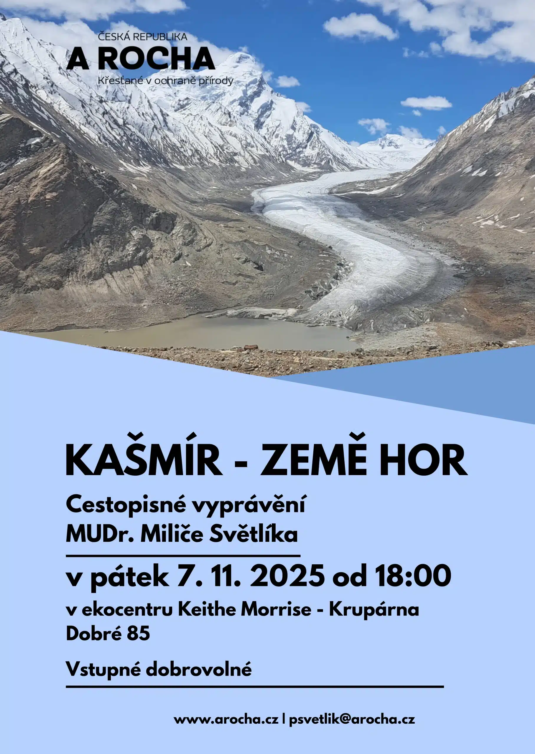 Vás zveme na přednášku Kašmír – země hor, která proběhne 7. 11. 2025 od 18:00 v ekocentru Keithe Morrise – Krupárna. Prostřednictvím vyprávění MUDr. Miliče Světlíka poznáme jeden z nejmalebnějších koutů Himaláje. Na motorkách i v autě projedeme Kašmírem, od zasněžených horských průsmyků až po tichá údolí. Uslyšíte zážitky a příběhy z cest a uvidíte fotografie, které zachycují drsnou a zároveň krásnou tvář tohoto regionu.
