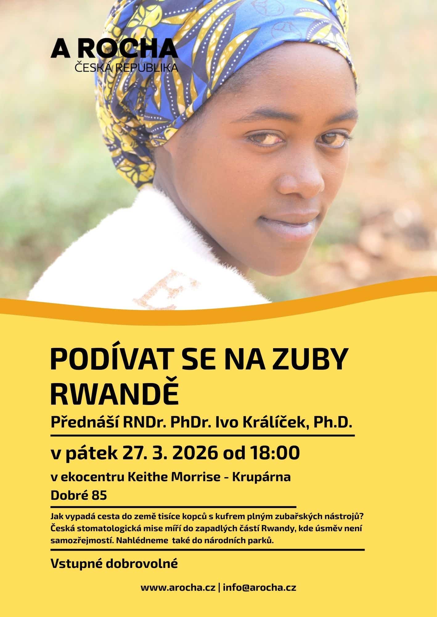 Srdečně Vás zveme na poslední březnovou přednášku: Podívat se na zuby Rwandě, která se koná v ekocentru Keithe Morrise – Krupárna v pátek 27. 3. 2026 od 18:00. RNDr. PhDr. Ivo Králíček, PhD. nám bude vyprávět, jak vypadá cesta do země tisíce kopců, když s sebou vezmete kufr plný zubařských nástrojů. Česká stomatologická mise zamířila do zapadlých částí Rwandy, kde úsměv není samozřejmostí. Společně se projdeme kolem jezera Kivu, nahlédneme do národních parků a zjistíme, že i divoká příroda má svůj „chrup“. Přijďte se podívat – slibujeme, že vás to nebude bolet!
